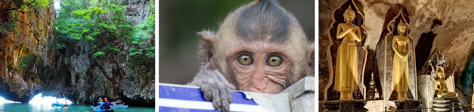 odkrywać malownicze jaskinie z perspektywy kajaka, spotkać Leżącego Buddę w Świątyni Buddyjskiej Wat Suwan Kuha oraz sfotografować psotne małpki zamieszkujące okolicę. Nie zabraknie także czasu na odpoczynek i delektowanie się pysznym tajskim lunchem w eleganckiej, położonej na wzgórzu restauracji z zapierającym dech, panoramicznym widokiem na całą zatokę Phang Nga, do której dotrzesz pickupem. Przygotuj się na dzień pełen wrażeń.